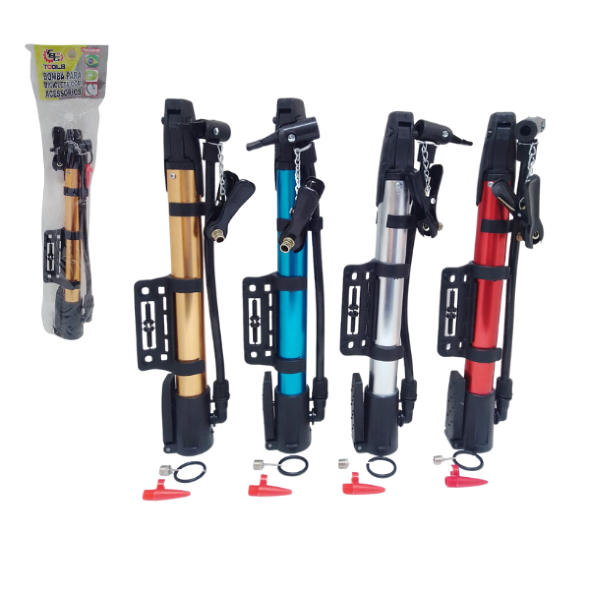 Descrição: Bomba de ar indicado para encher pneus de bicicletas e bolas. Possui trava de segurança para impedir que o bico escape e o ar vaze.
