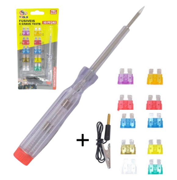 Descrição: Kit de 10 fusíveis + 1 chave teste + 1 jacaré. Fusível de lâmina padrão, escudo transparente para detecção rápida de fusíveis fundidos.