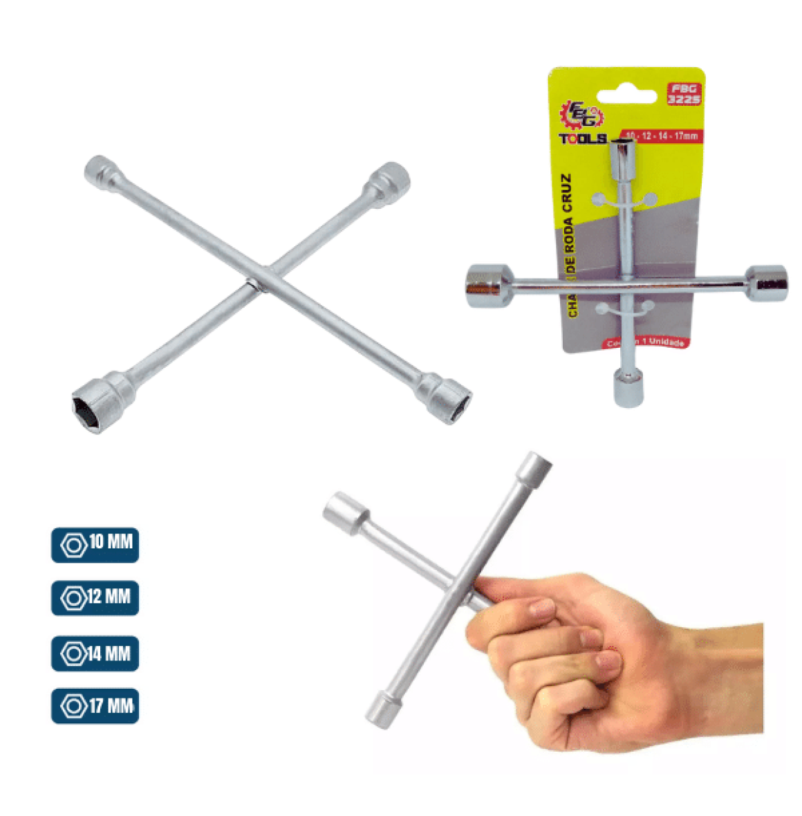 Descrição: Mini chave em cruz com tamanhos - 10 / 12 / 14 / 17mm. Ideal para ter no veiculo, podendo ser utilizada como chave de roda, pois serve para aperto e desaperto de parafusos e porcas.