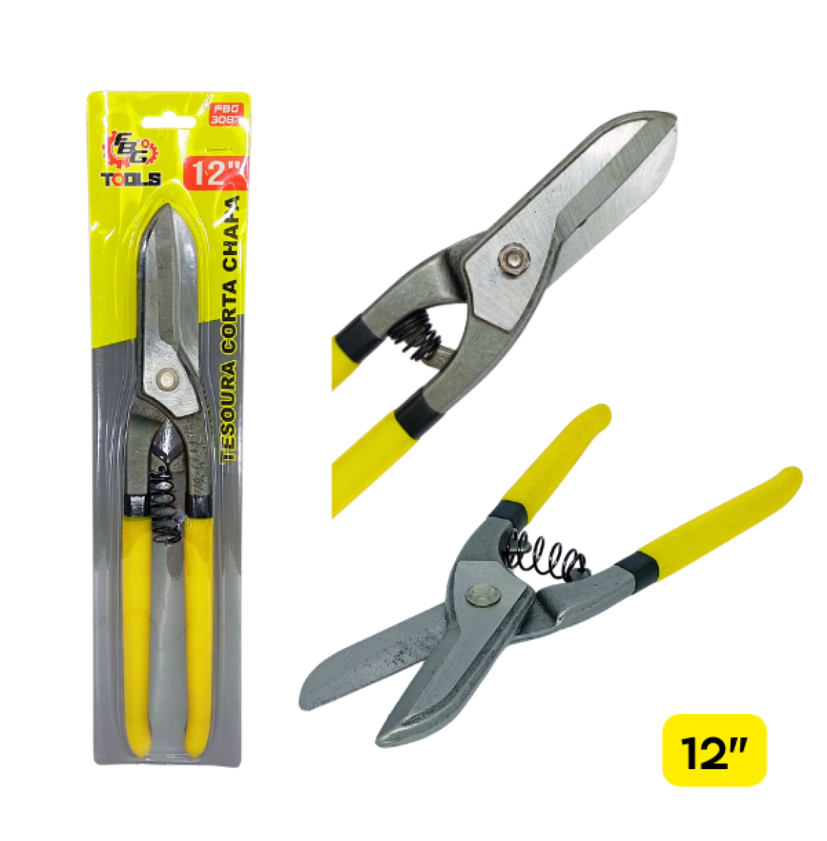 TESOURA CORTA CHAPA 12 - MODELO FBG 3087 Tessoura corta chapa FBG foi projetado para oferecer praticidade, qualidade e durabilidade. Fabricado com materiais de alta qualidade Marca: FBG Modelo: 3087 Descrição: Tesoura fabricada em cromo vanádio e aço durável, ponta super polida, mangas de isolamento elétrico e cabo emborrachado. NCM: 8203.20.10