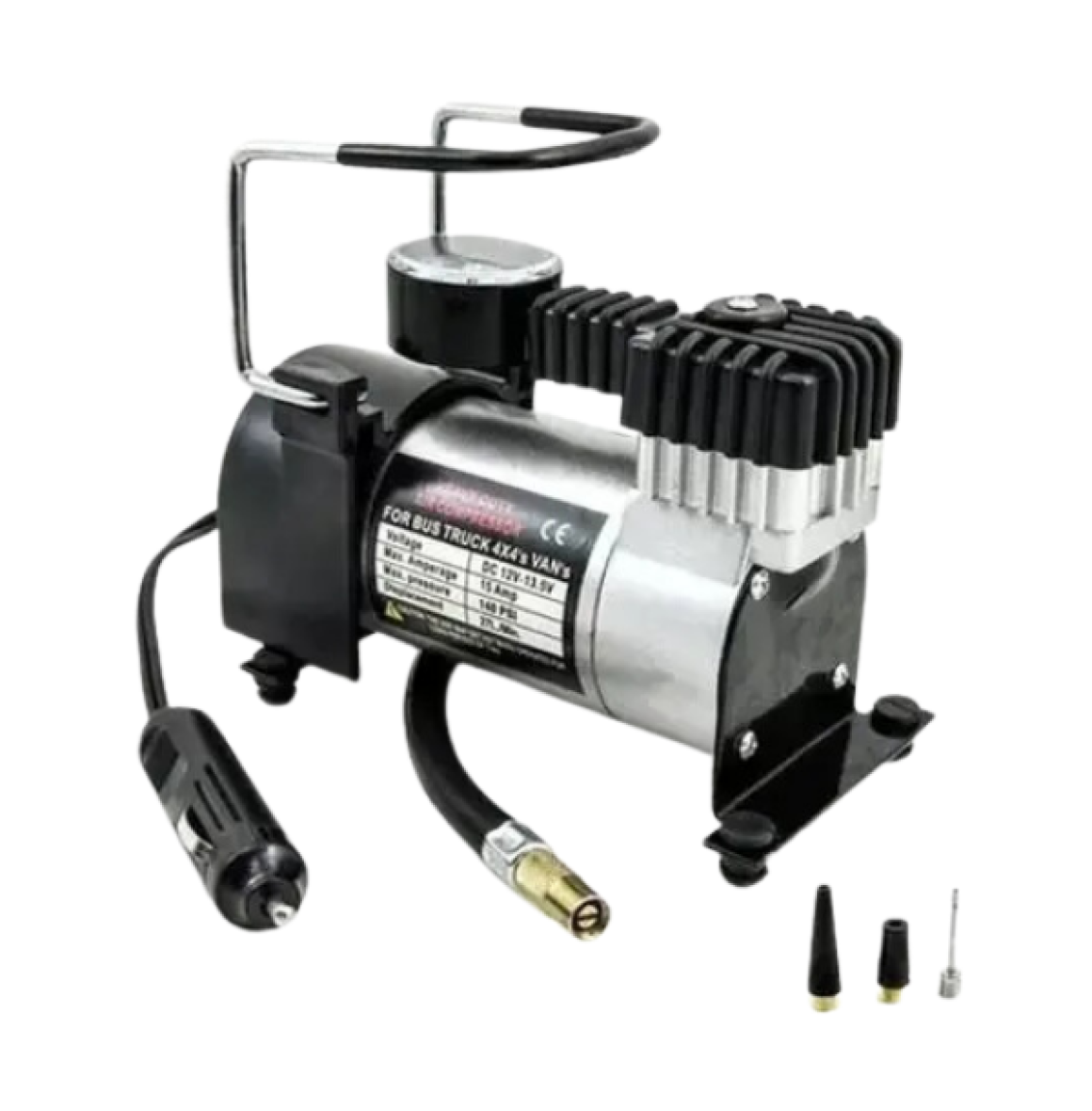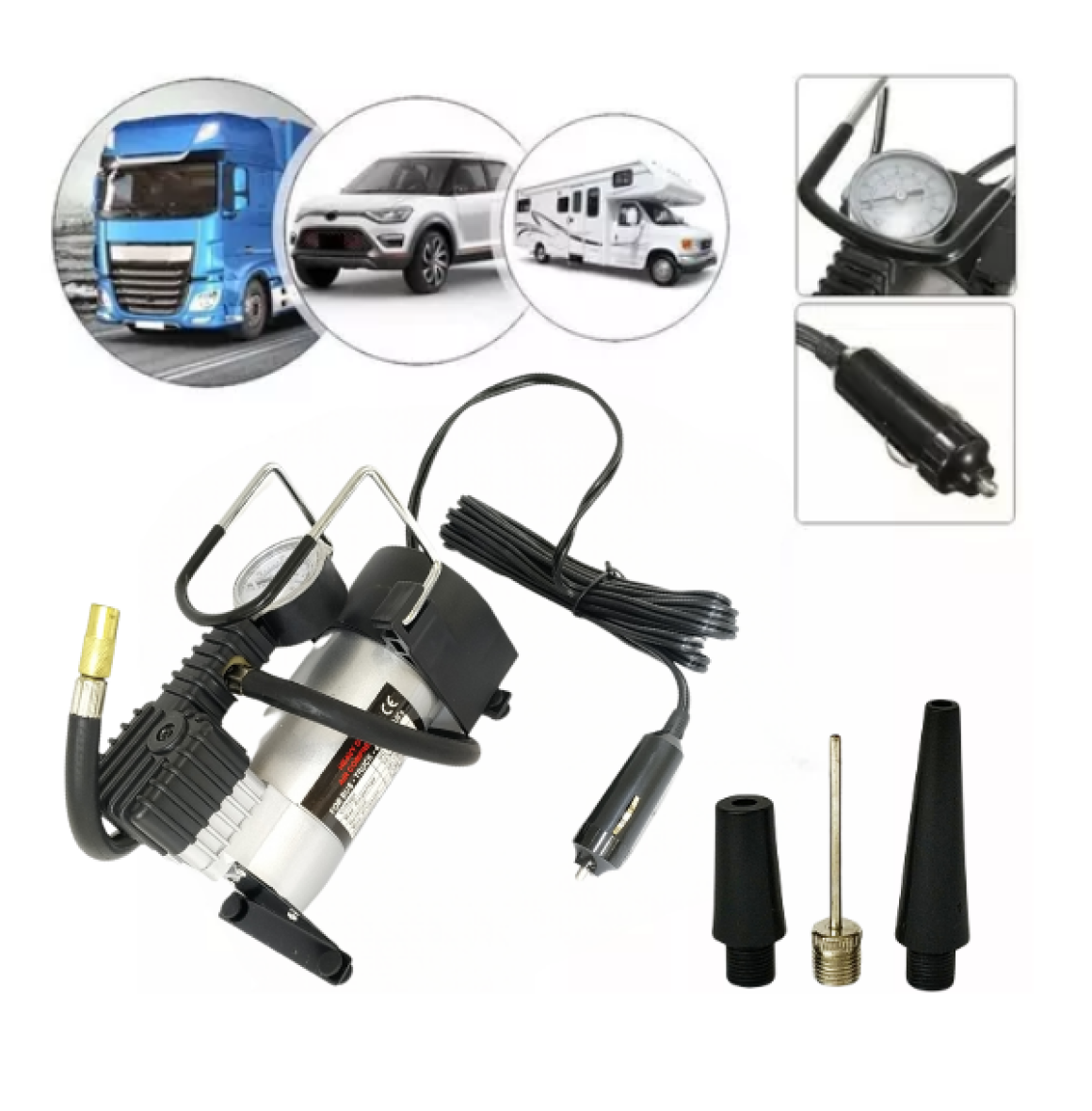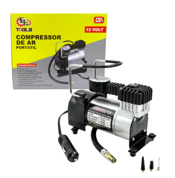 Descrição: Mini compressor de ar portátil - tensão 12 volts - taxa de fluxo: 40L/min. Amperagem máxima 15amp. Pressão maxima 150 psi. Com medidor de pressão/dial de escala psi (LB/POL 2)