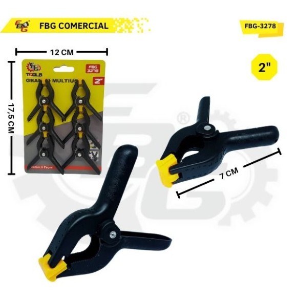 Descrição: Grampo multiuso embalagem com 6 peças no tamanho 2´´. Mandíbulas articuladas para uma melhor aderência em superfícies irregulares. Alças antiderrapantes e confortávei de segurar.