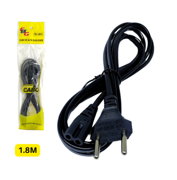 Descrição: Cabo de energia universal com tensão maxima suportada até 250V AC Bivolt. Cabo redondo flexivel bipolar, plugue fêmea oitinho e plugue macho 2 pinos. Comprimento do Cabo 1.8 metros e espessura do pino de aproximadamente 4MM