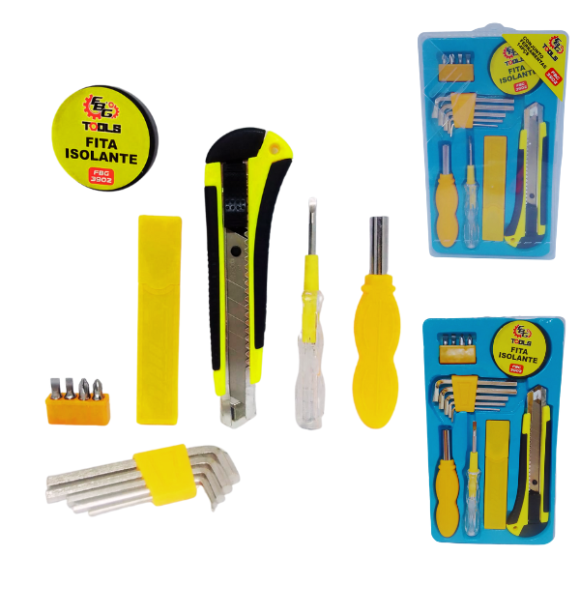 Descrição: Conjunto com 14 peças com estojo - 1 Estilete / 1 Fita isolante / 1 Lamina extra / 1 Adaptador / 4 Pontas / 1 Chave com duas pontas (Fenda e Philips) / 5 Chave allen