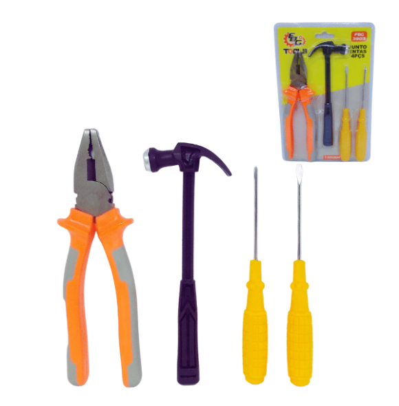 Descrição: Conjunto com 4 peças contendo - 1 Alicate com cabo emborrachado / 1 Martelo sendo em plástico com a ponta em metal / 2 Chaves de fenda de plático