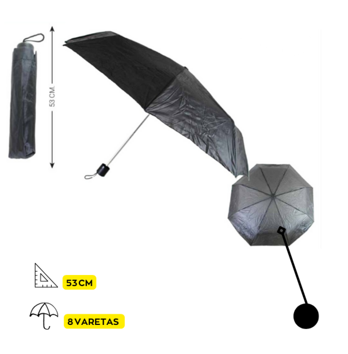 Descrição: Sombrinha de 53 cm com 8 varetas, abertura manual. Disponível na cor preta.