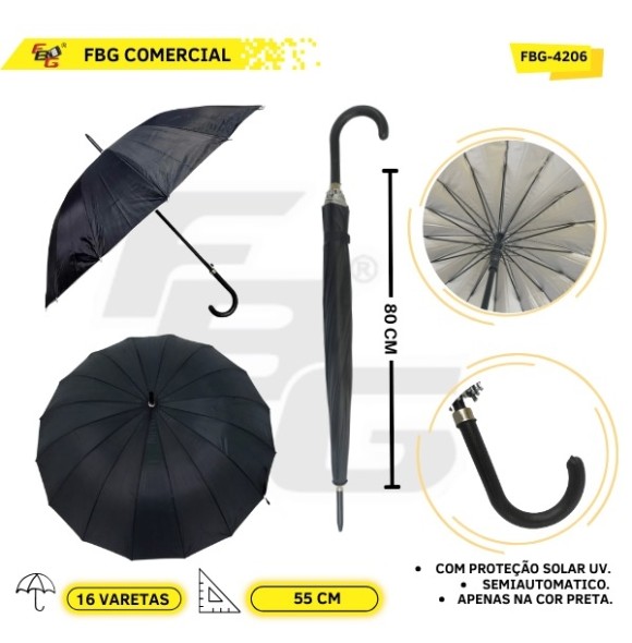 Descrição: Guarda chuva de 55cm com 16 varetas, abertura automática, cabo curvado. Disponível na cor preto com parte interna prateada.