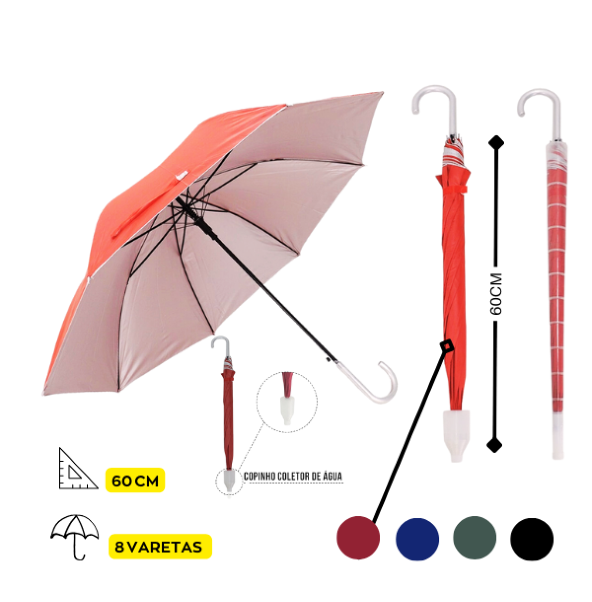 Descrição: Guarda chuva de 60cm com 8 varetas, abertura automática, cabo curvado, com copo coletor de água. Disponível em diversas cores, sendo com parte a interna prateada.