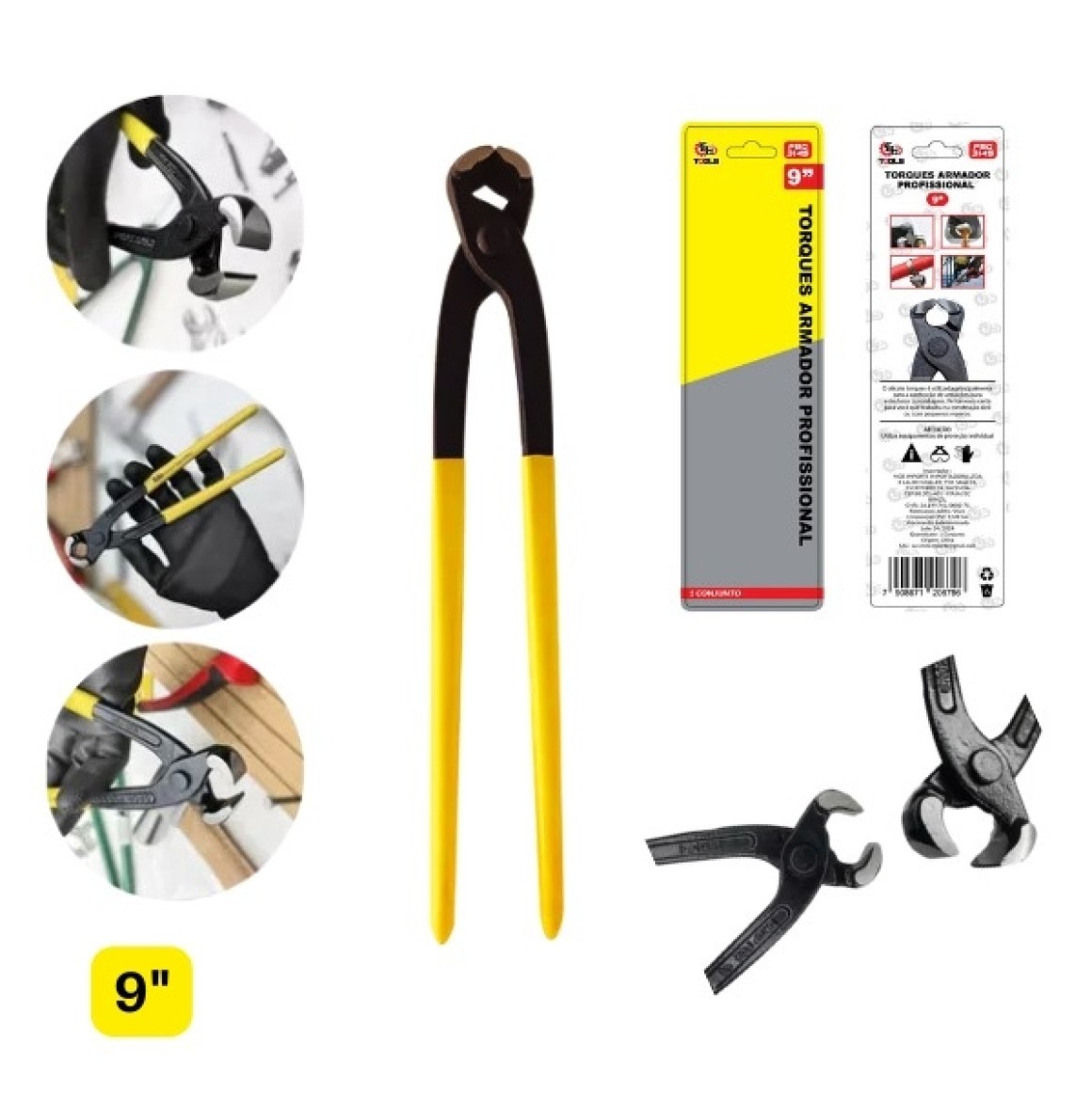 Descrição: Alicate de tamanho 9´´ com 23 cm e cabo emborrachado. O alicate torques é utilizado principalmente para a confecção de armações para estruturas concretagem.