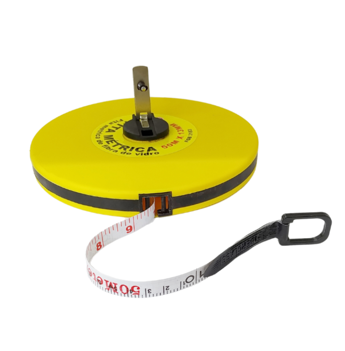 Descrição: Fita métrica de fibra de vidro. Medidas: 50M x 13MM