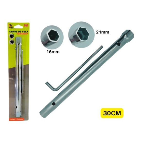 Descrição: Jogo chave de vela de 16mm e 21mm. Feita de aço, material de alta resistencia, ideal para substituir velas de ignição. Boca dupla de 16 e 21mm e comprimento de 300mm.