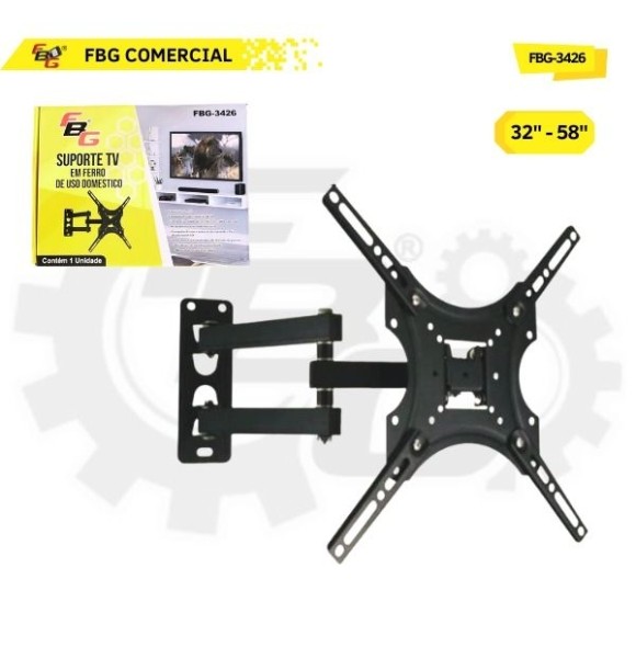 Descrição: Suporte de tv em ferro, compatível com a maioria das TVs de plasma/Led. Para TV de 32 - 58 polegadas. Capacidade máxima de 50 kilos e inclinação +-15°